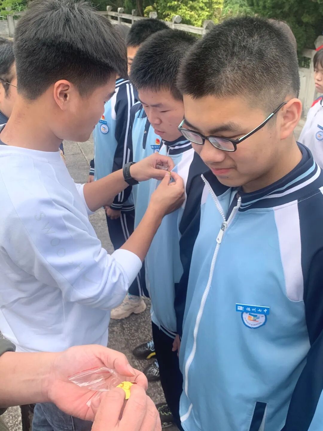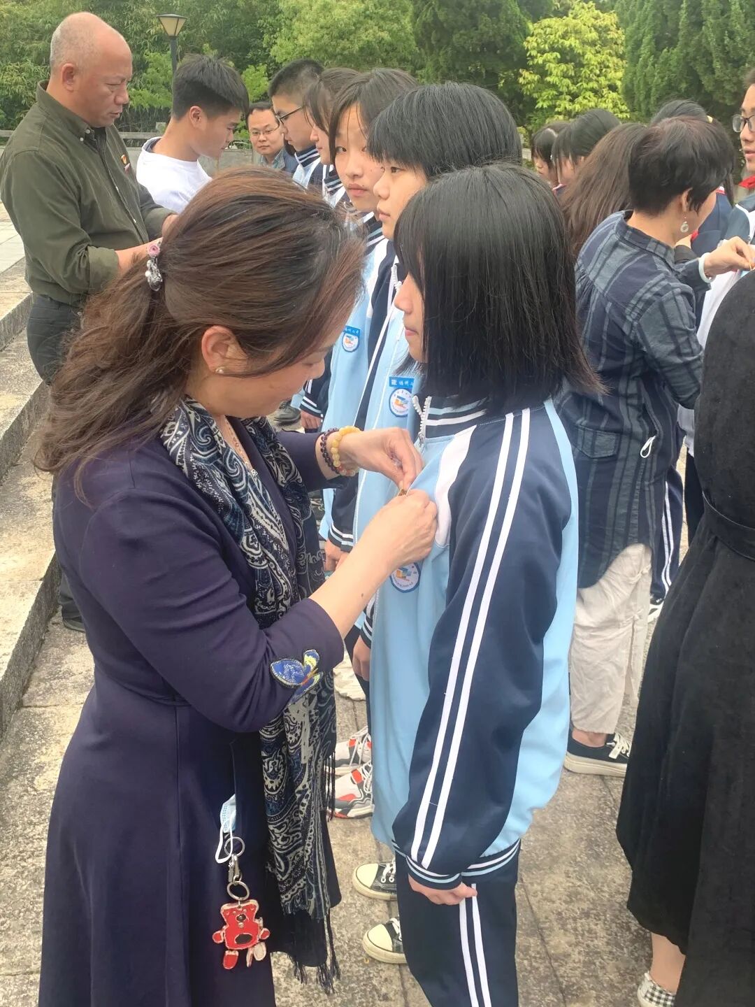 随后,党员教师代表为新团员佩戴团徽。紧接着,由团员代表高二(8)班林可喻同学带领全体新团员进行入团宣誓。