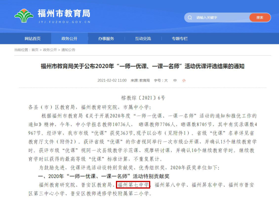 据福州市教育局榕教综〔2021〕6号文件,在本次评选活动中,我校共获评省级优课5节,市级优课17节。学校荣获本次活动“特别贡献奖”。