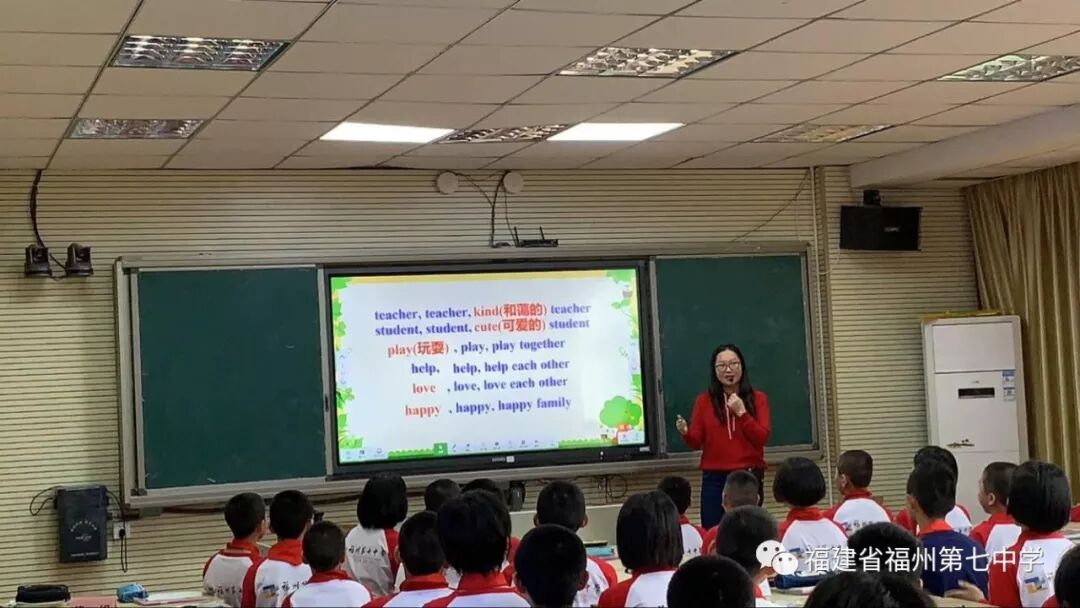 第一节课由林杨老师执教。林杨老师的课堂设计灵活、新奇有趣,Let’s enjoy环节,她将family 比喻成花,星星等,让学生欣赏,深深吸引了学生与听课者。