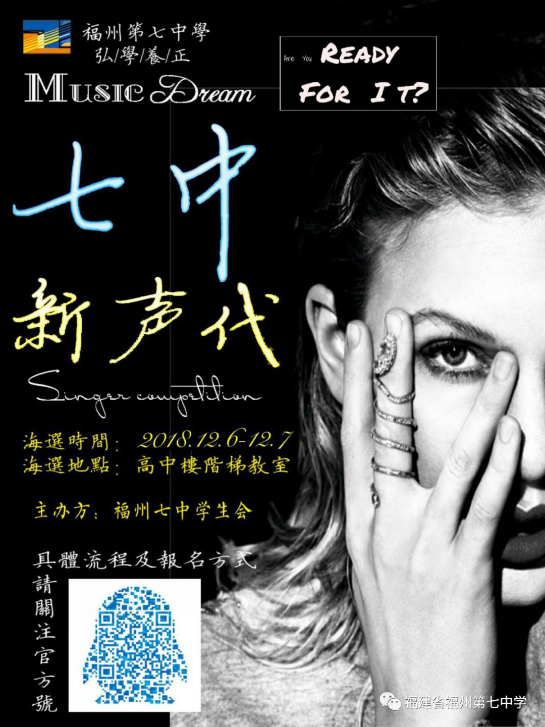 3、晋级选手将进行现场抽签,分两组进行决赛,决赛可使用伴奏带或自弹自唱,时间为3分钟以内,最终由评委打分,评选“七中新声代”歌手十名。