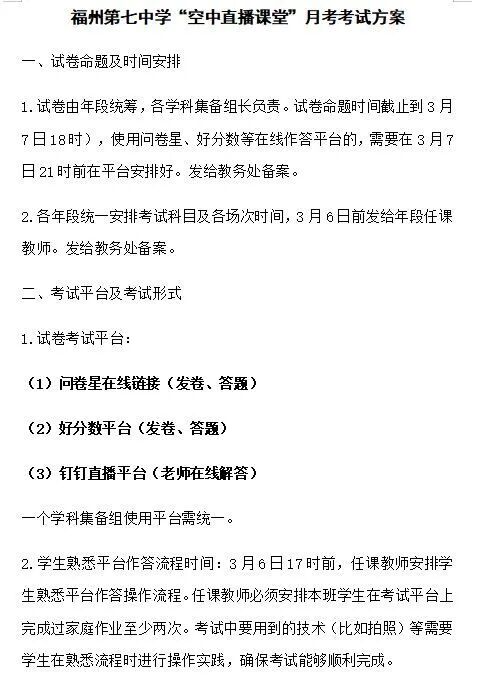 本次月考在校领导班子的部署下,由分管高中教学的郑仁荣副校长和教务处负责具体实施。经过前一阶段的线上教学工作实践,老师们已经积累了许多有效的工作经验,各年段长和集备组组长们进行充分的沟通、研究、商讨后,制定出了一套科学详细的“云”考方案。