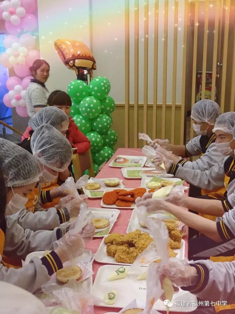 下午3:00,同学们在店员小姚姐姐的带领下,洗手,带上口罩,带好护帽,有序地参观了德克士餐厅的后厨,了解食品制作过程与食品安全标准。然后在专业厨师的指导下,或合作或独立完成汉堡、炸鸡块的制作,并当了一回小店员,体验为顾客点餐的过程。