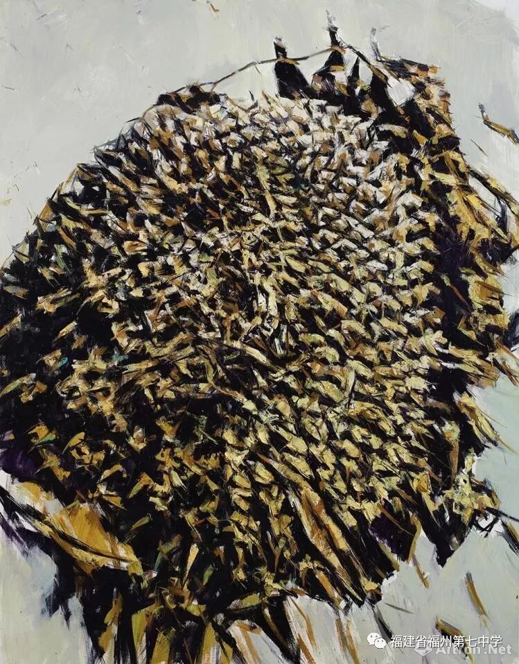 “沉甸甸的葵头悬带着一颗颗种子的分量,这些种子饱满而褶皱,葵盘表面坚忍而崎岖,花瓣通常已经凋落近半,却仍然保持着葵的姿态,这些葵带着它们一粒粒小小的希望在逆境中挣扎,纵使已被岁月压折了头颅,却依然挺立着脊椎,依然不灭对生命的热爱。”许嘉在《我的父亲》一文中便直言这些“头颅”是父亲这一代人的写照。故在她笔下,和父亲同龄的孙歌老师在看过父亲的画后会说:“许多画家的画很漂亮,但仅仅是漂亮。而看许先生的画,我在其中看到了自己。”这也是为什么许多和父亲同辈的人会看着父亲的画甚至流泪的原因。曾有一个观众对父亲说:“一支葵的残破叫残破,一片葵的残破叫一代人。”