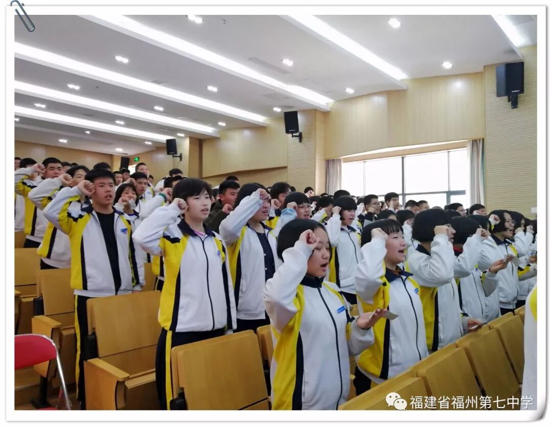 在奏唱国歌声中,福州七中2018年“你的坚持 终将美好——福州七中初三年段迎中考百日誓师大会”拉开了帷幕。