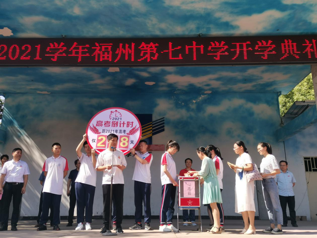 倒计时揭牌仪式后,邱晓兴校长代表学校致辞,邱校长首先代表学校、党总支欢迎初一、高一的新同学加入福州七中这个大家庭,同时回顾2020届中高考取得的成绩,并预祝2021届初、高三的学子能更上一层楼。邱校长也列举了我校在申创省一级达标高中过程中发生的点点变化,这些变化无不渗透着国家、学校、社会、家长对学子们的新期待。