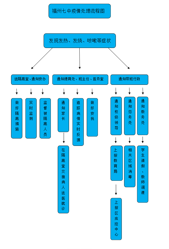 第一时间引导该生到隔离室隔离,通知保安做好隔离警戒,第一时间上报本校疫情防控工作小组。总务处工作人员第一时间穿戴好防护装备、对该区域及该师生行走路径全面消毒。防控工作小组第一时间上报区教育局及属地疾控部门,同时电话联系120。德育处(办公室)工作人员联系班主任、家长,落实患者个人相关信息。教务处、办公室工作人员做好登记、记录等后续工作。