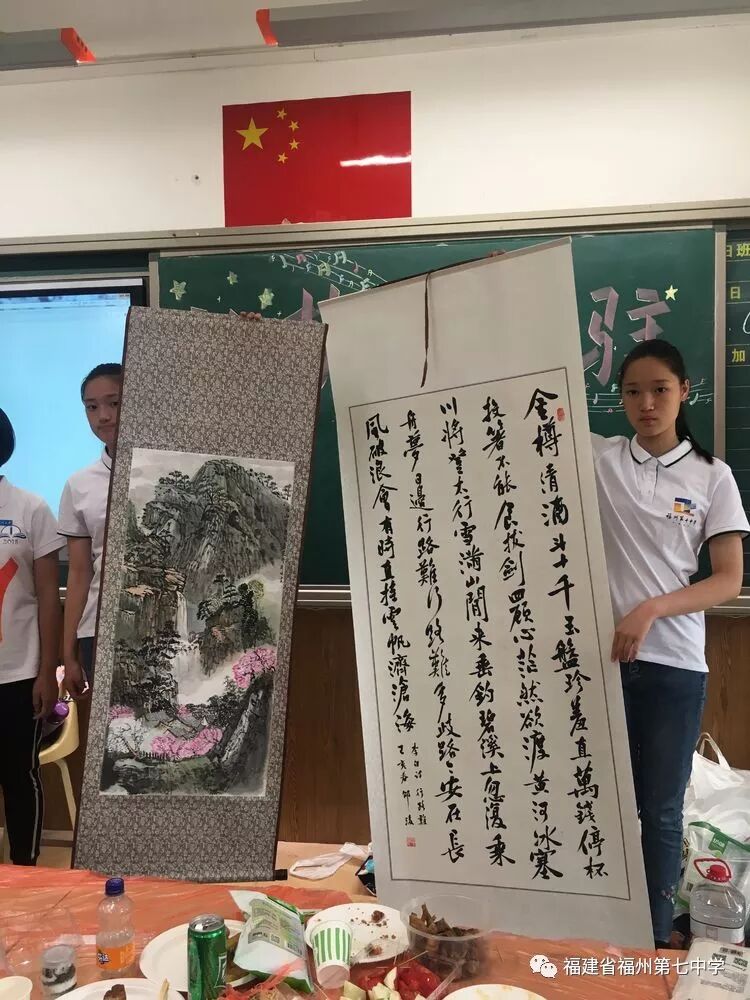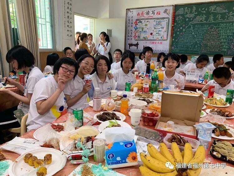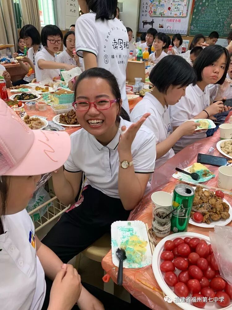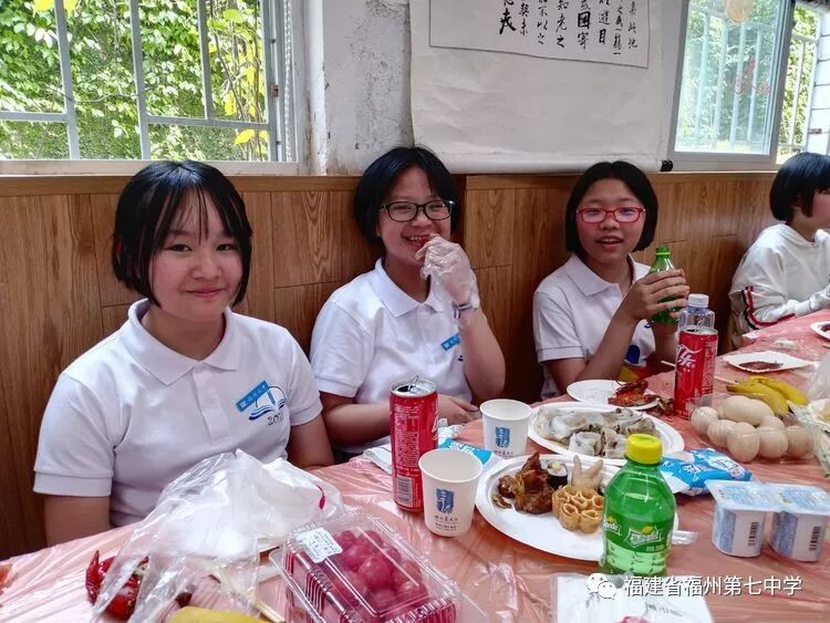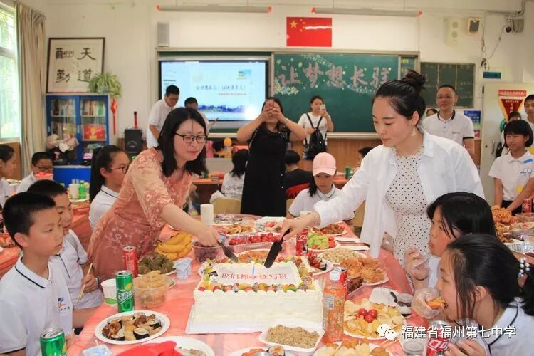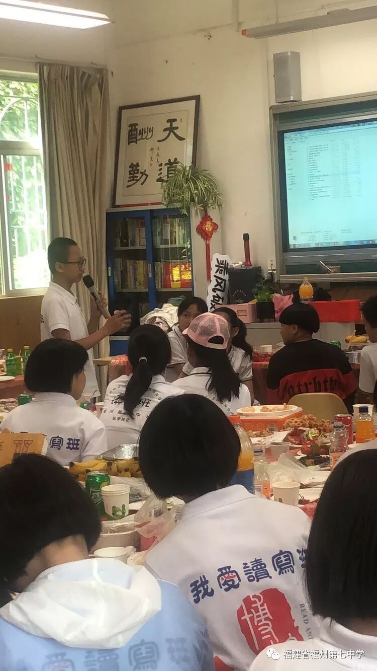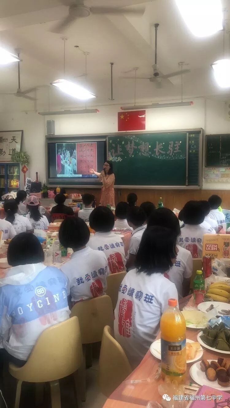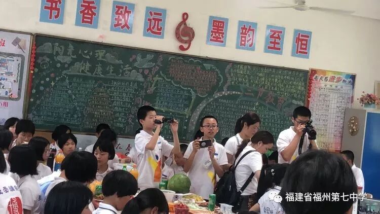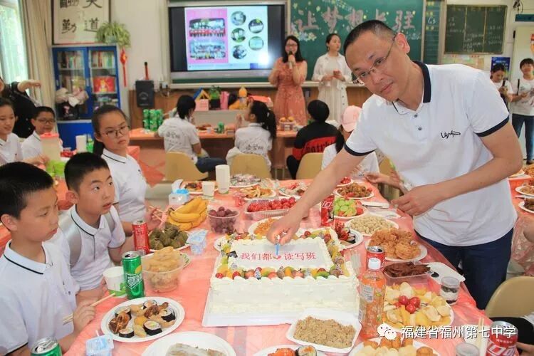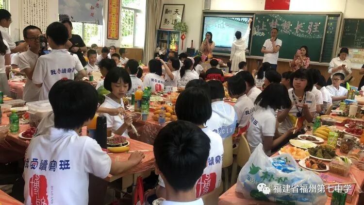 在初一(1)班的课室里,同学们饶有兴趣听吴剑琴老师的讲解。同学们一边兴奋地观看老师精心制作的班级读写活动宣传片,一边享受着父母亲为大家准备的美食,有的同学认真听老师介绍初中的学习情况、生活情况,有的同学直接向老师提出自己对初中生活的疑问,吴老师一一耐心地解答。