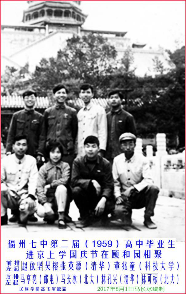 1959 年,我们班到北京上学的八人:科技大学董兆童;清华大学赵依坚(工程化学系)、林孔兴、吴榕(女)和张英源(3 人都是电机系);邮电学院马亨亮;北京大学林可标(技术物理系,就是原子能)和我。国庆十周年我们都到天安门广场参加了庆典,次日一起去颐和园聚会。文史班高飞宝上了民族学院,学习高山语,毕业到前线广播电台工作,后来到厦门大学台湾研究所。我们在北京联系比较少。