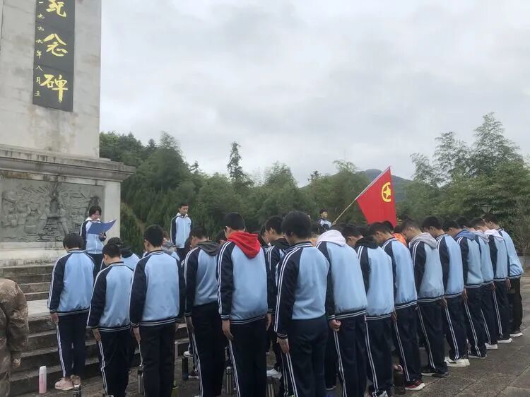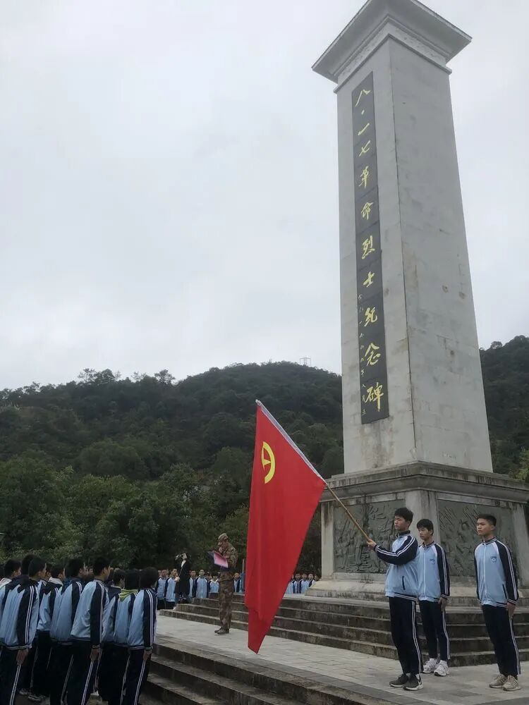 站在八一七革命烈士纪念碑前,初二全体学生在纪念碑前排成整齐的方阵,默哀一分钟,表达对烈士的崇高敬意与哀思。学生们还向烈士敬献自己手工制作的纸花,向革命烈士致敬。在辅导员带领下紧握右拳,激情宣誓,铿锵有力的宣誓声,响彻云霄。