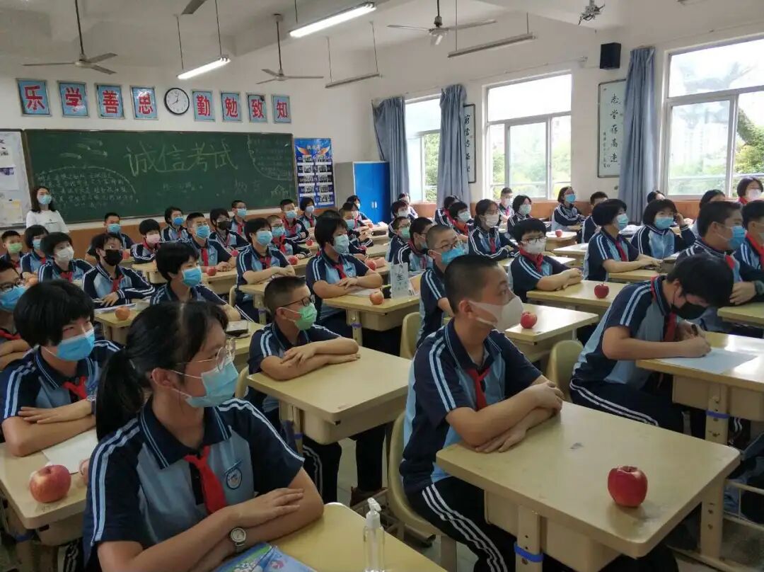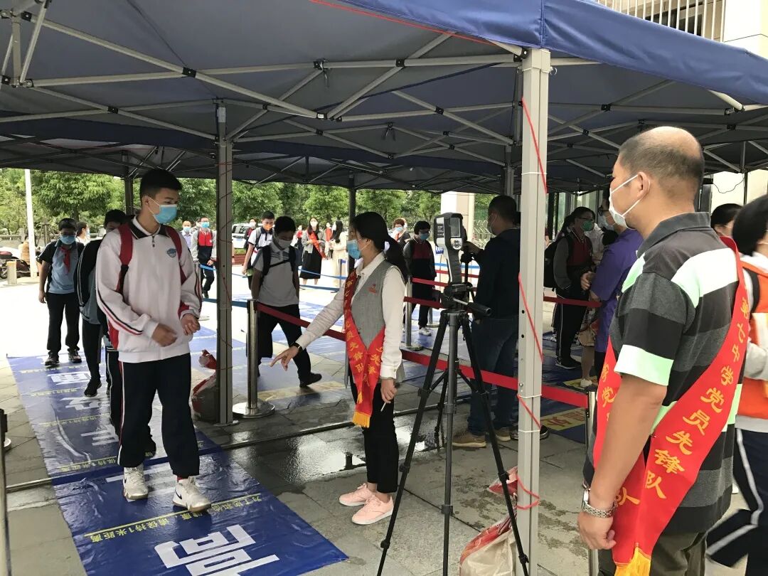 在前期初、高三复学经验的基础上,按照前期的预案演习流程,学校执行严格的学生入校体温检测制度,以严谨的态度与熟练的操作,保障学生入校安全。学生入校均佩戴口罩,校园大门设置了八个入校通道,通道上每隔1米贴有学生进校排队的安全距离标识。学生必须通过人体热成像系统测温正常后,才能进入校园。