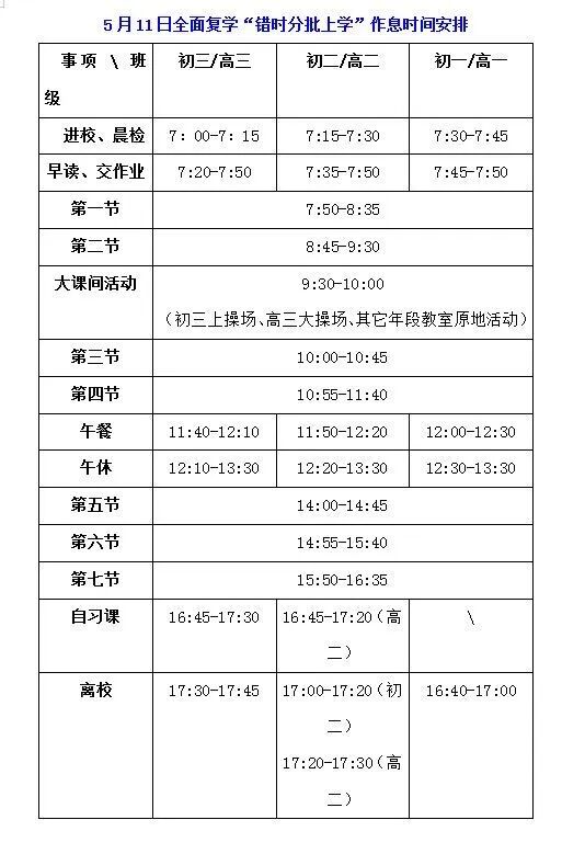 1.关于错峰上下学,各班级分时段到校,具体安排如下: