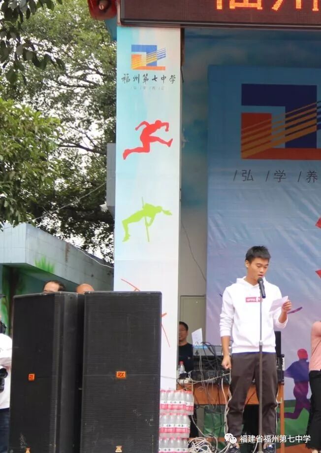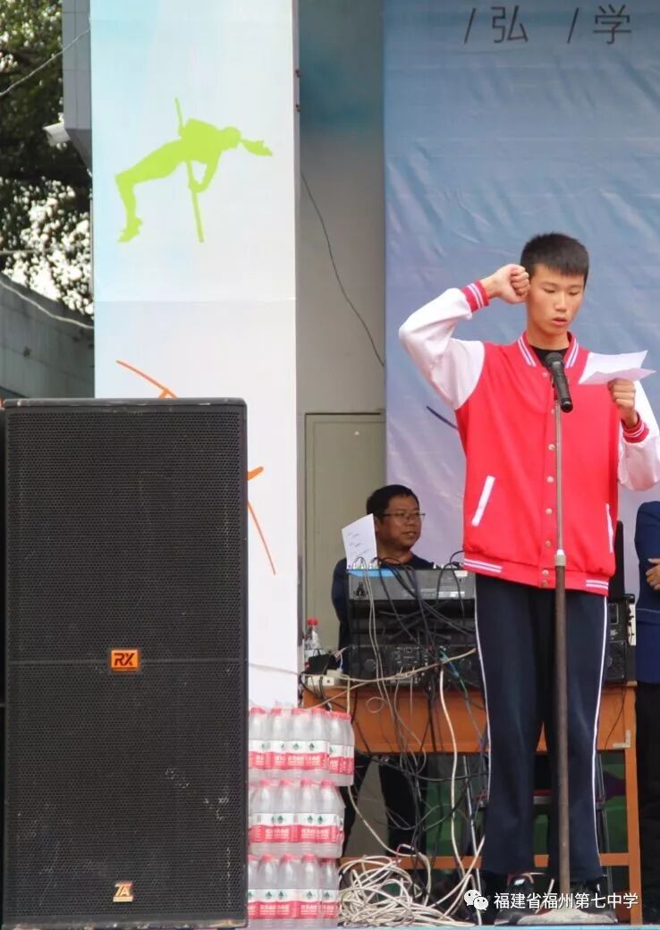 初三(1)黄庆霖同学代表运动员发言。他表示,作为运动员,将严格遵守比赛规则和赛场纪律,服从裁判,尊重对手,团结协作,顽强拼搏,赛出水平,赛出风格,做到“友谊第一,比赛第二”,以积极饱满热情的态度参加本届运动会。