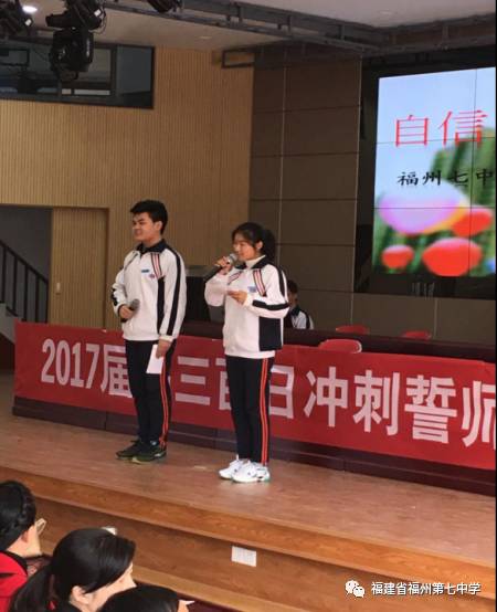 为了充分调动学生的积极性和斗志。大会安排了“喊出自己的口号,为自己加油”活动,由各班学生上台展示本班的高考标语,并大声喊出班级口号。高三学生的宣誓声响彻教室,展现了他们为梦想奋力拼搏的昂扬斗志。随后,全体高三学生高举右拳,进行了庄严的宣誓,嘹亮的口号声表达了高三学生誓创2017高考奇迹的必胜信念。